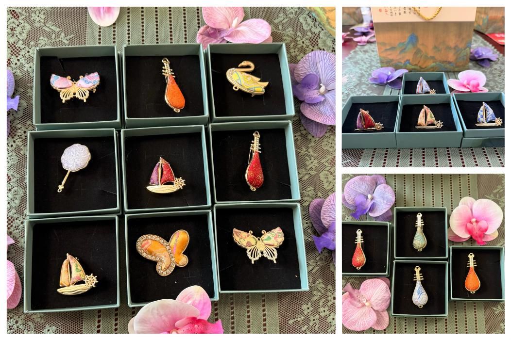 DIY制作环节中,女教职工们热情高涨、兴致盎然。在手工教师的细致指导下,大家纷纷化身“手作匠人”,从选料、裁剪到粘贴、组装,每一个步骤都一丝不苟。现场氛围温馨而热烈,大家一边专注创作,一边相互交流心得、分享创意,在欢声笑语间,一块块精美绝伦的宋锦面料,被巧妙制作成一枚枚独具匠心的胸针。女教职工们纷纷佩戴起自己的作品合影留念,锦缎流光与灿烂笑容交相辉映,定格下这个春日午后最美的画面。